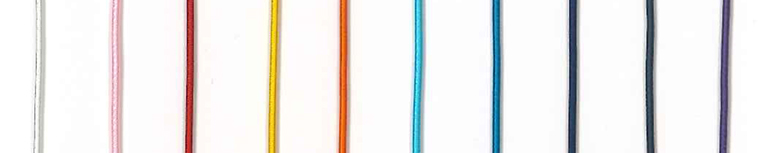 天然ゴムを芯にして外側をレーヨン糸で組み上げた丸ゴムです。 兄弟商品に「カラーゴム」があり、太さが異なるラインナップとなりました。 従来商品の「カラーゴム」は約1.5㎜の太さで今回ご紹介の「カラーゴム」は約1㎜と細い仕様となっています。細いタイプの丸ゴムがご希望の際は是非お問い合わせください! 表面がレーヨン糸のためソフトで光沢があり上品な丸ゴムです。ただし色落ちがありますので取り扱いにはご注意ください。 主に商品タグ、ボトルネック、旅行用ネームタグやラッピングに使用されます。 弊社では丸ゴムを輪加工にすることもできます。 |